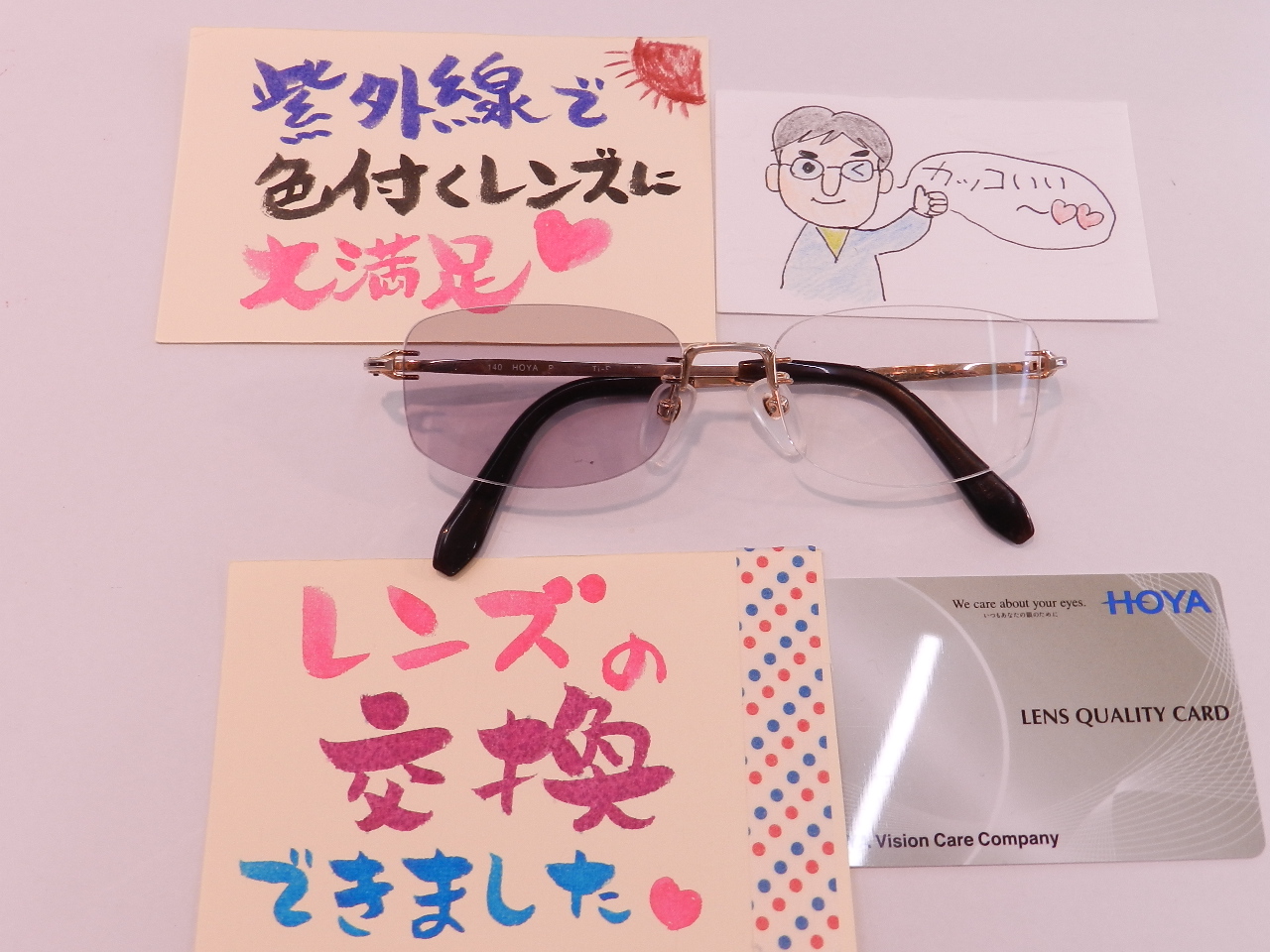 #HOYAレンズ #レンズの交換 #枠なしメガネ #調光レンズ #紫外線に反応 #サンテックレンズ #グレー #マルシェ