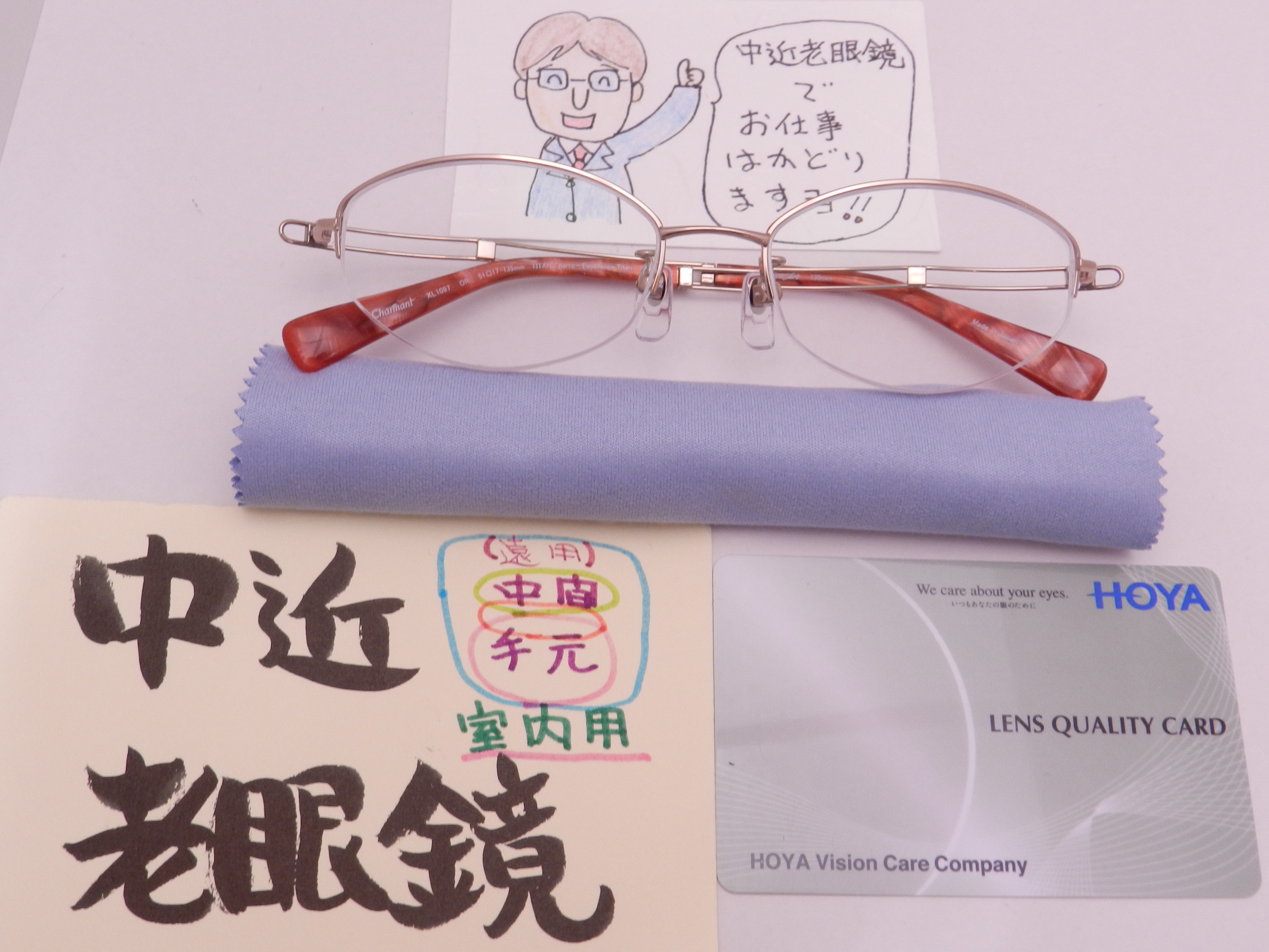 室内で使う慣れやすい中近室内老眼鏡でお作りいただきました。