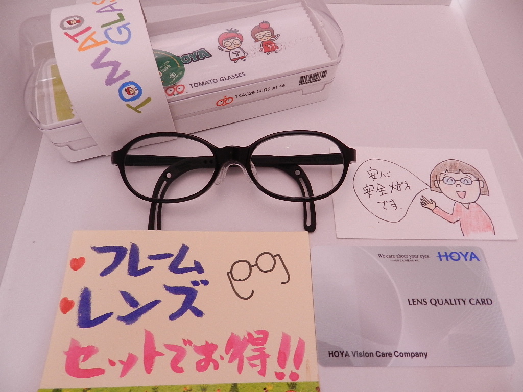 #HOYAレンズ #レンズが薄くなる加工 #ヘルプ加工 #子供用安全メガネ #トマトグラッシー #予備が付いている #ベルト付き #フレーム+レンズのセット価格
