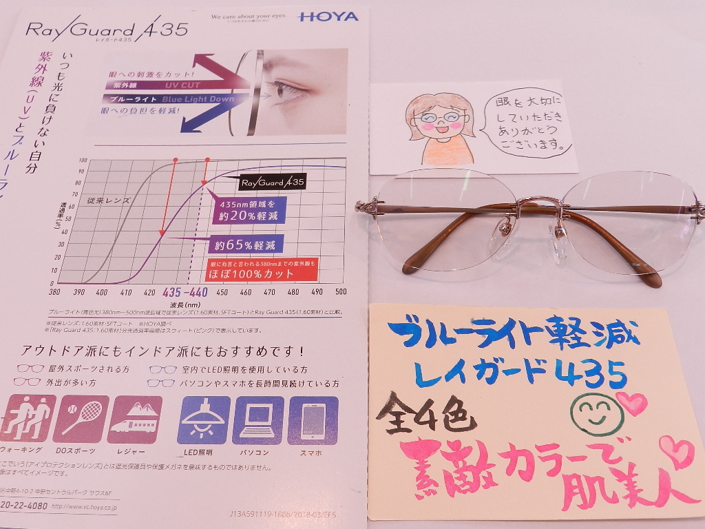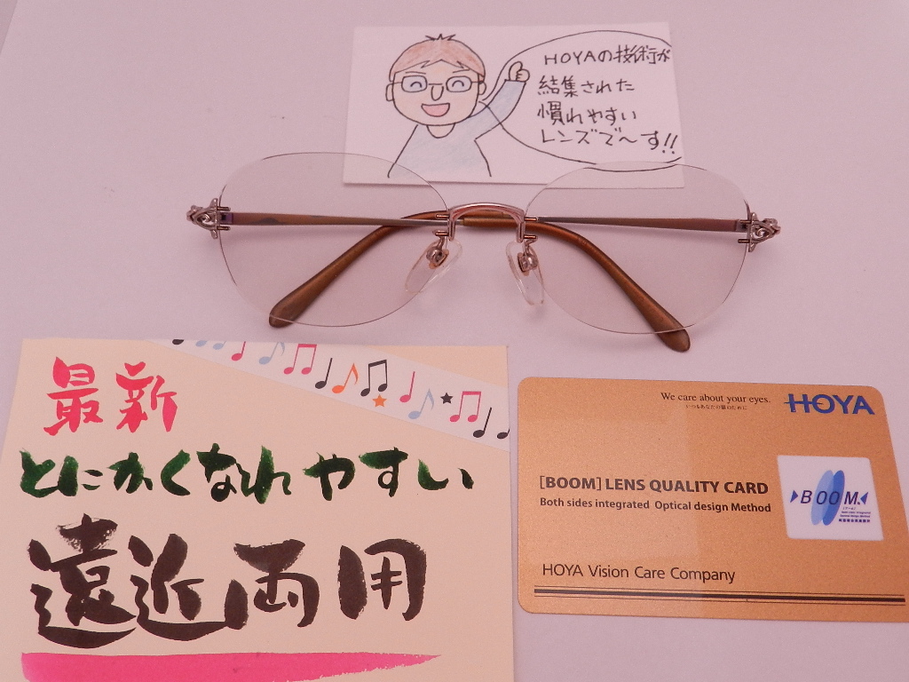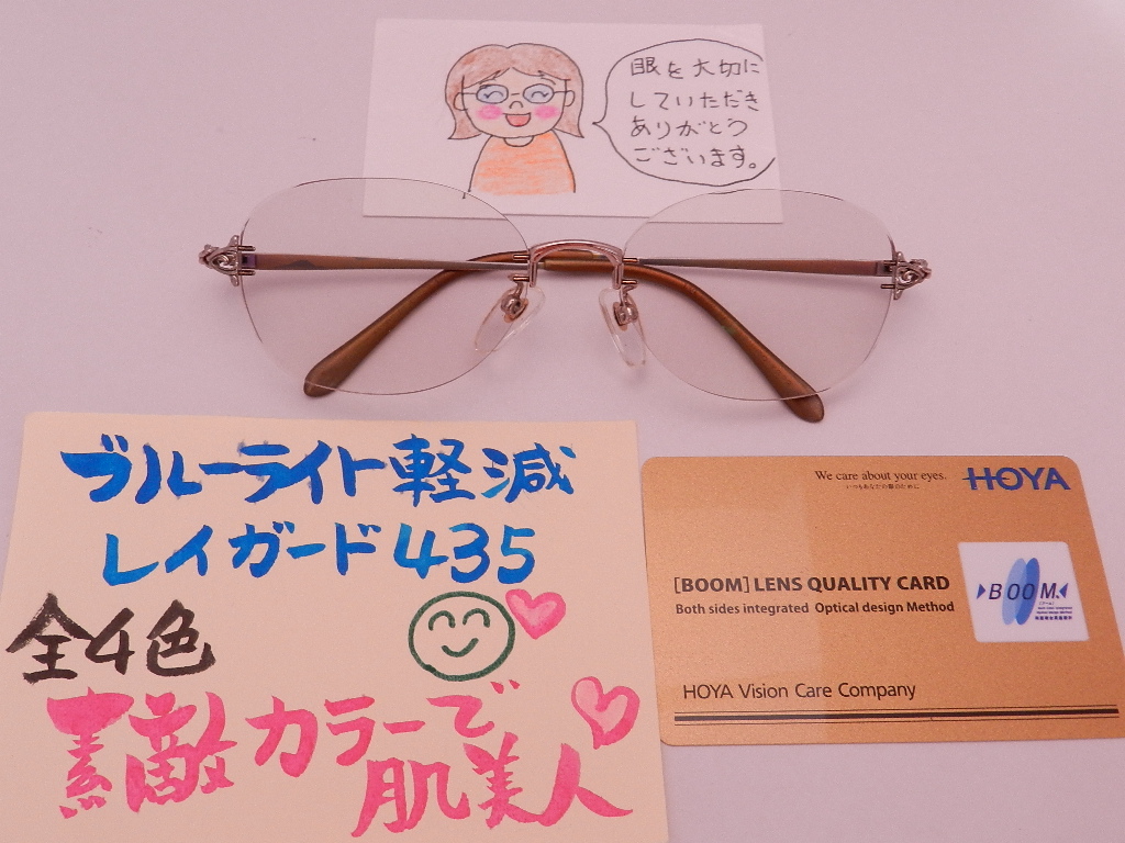 #HOYAレンズ #慣れやすい遠近両用[BOOM] #眼の健康を考えたブルーライト軽減 #レイガード435 #お肌美人カラー #枠なしフレーム #レンズ交換
