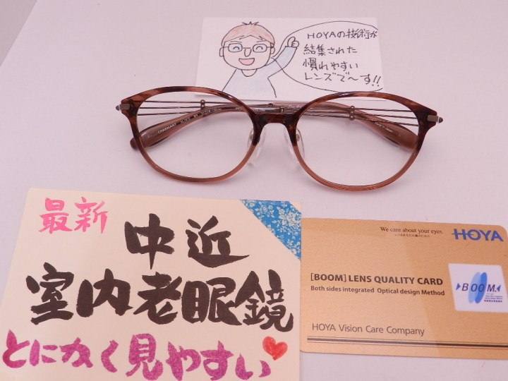 以前と同じ慣れやすい中近室内老眼鏡[BOOM]でお作りいただきました。