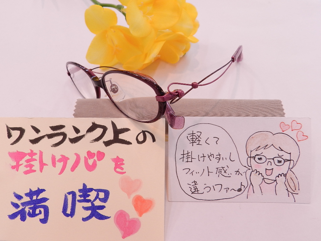 ワインカラーにテンプル部分が可愛いフレームをおすすめさせていただいたところ、