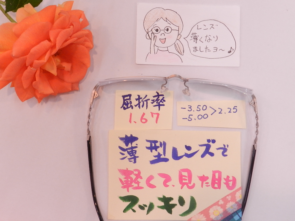 -5と厚みが出ますので1.67の薄型レンズをお使いいただきました。(*^▽^*)
