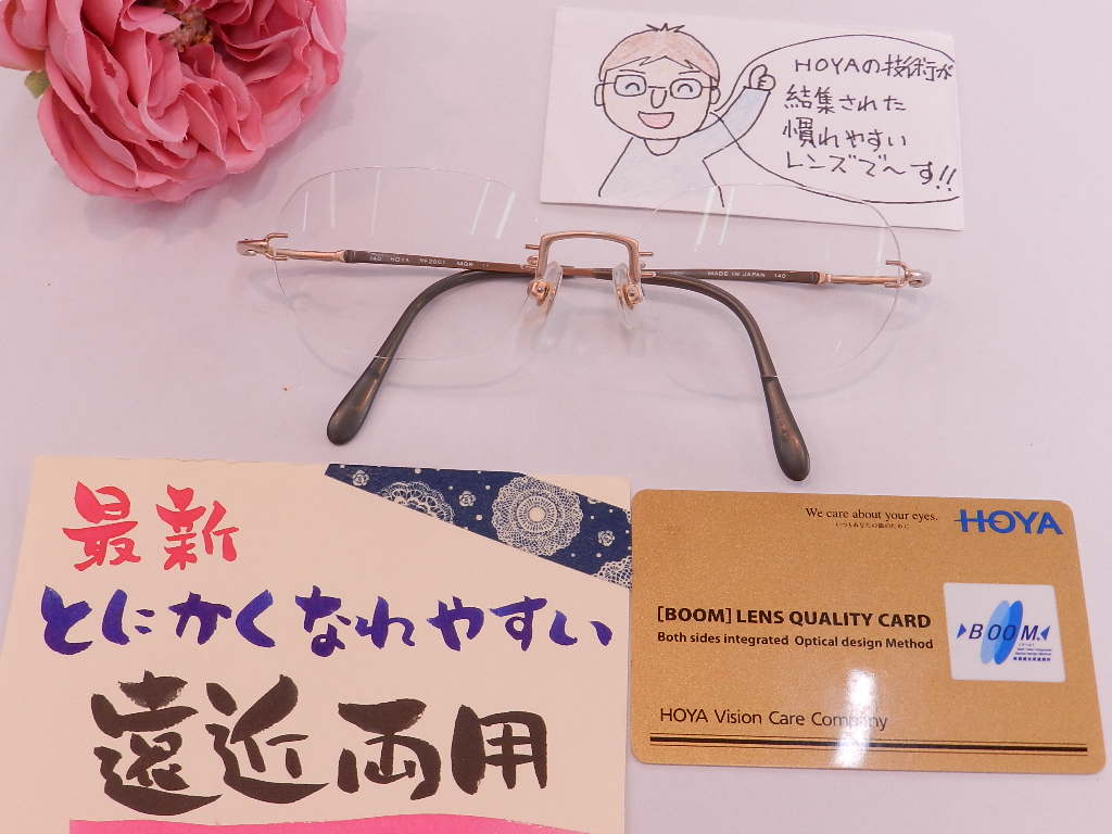#HOYALUX #慣れやすい遠近両用 #[BOOM]ウエルナ #色の変わるサンテックレンズグレー #枠なしフレーム #レンズの交換 #上山市メガネのエース #メガネの事ならお任せください