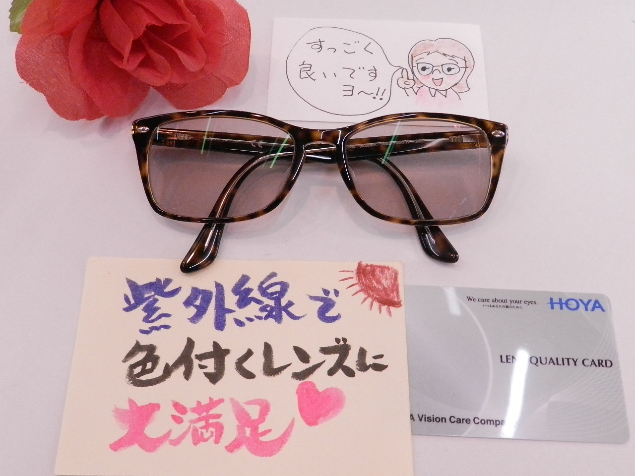 との事で、紫外線で色が付く調光レンズをおすすめさせていただきました。