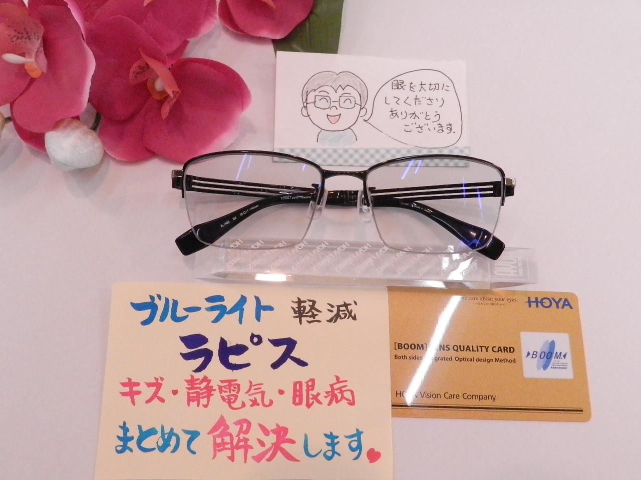 眼の健康を考えたブルーライト軽減ラピスをお付けいただきました。